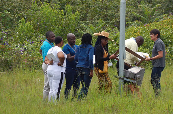 Hands-on group work during the pre-symposium workshop on the application of geographical information systems in sustainability research: Sanet Carow (Department of Geography, Unisa) (right) assists participants to capture field data on their devices in preparation for a practical GIS exercise.