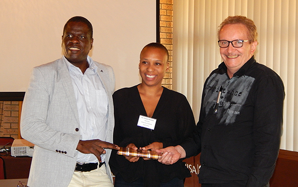 Dr Inocent Moyo (University of Zululand) and Hlengiwe Cele (University of Zululand) receive the award for runner up to the best paper from Prof Rudi Pretorius (Department of Geography, Unisa). Their paper was entitled "Protected areas and environmental conservation in KwaZulu-Natal, South Africa: On marginalisation, livelihoods and sustainable development".