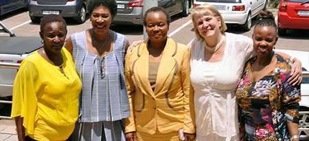 An audience member, Maria Madiope (Chairperson: UWF), Dr Gwen Ramokgopa (MEC: Gauteng Health), Dr Britta Zawada Deputy ED: CHS), and Moipone Masalesa (Regional Director: Unisa Gauteng Region)