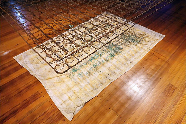Andrea Walters, #OverMyDeadBody III (2022). Suspended rusted mattress, double bedsheet and Sunlight soap residue.