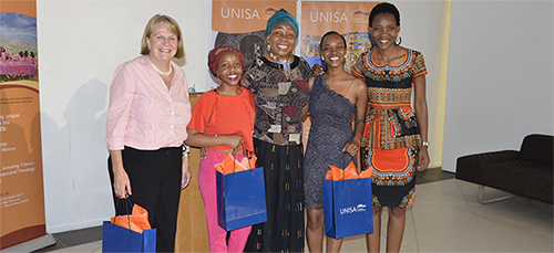 Pictured are Dr Britta Zawada (Deputy Dean, College of Human Sciences); Busisiwe Mahlangu; Gcina Mhlophe; Nkateko Masinga; and Prof Puleng Segalo (Head: Research and Graduate Studies, College of Human Sciences).