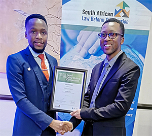 Gilbert Phindile Kato (right), winner of the Pius Langa South African Law Reform Commission Legal Essay Writing Competition, shaking hands with his supervisor, Nzumbululo Silas Siphuma, from the Department of Jurisprudence in the College of Law.