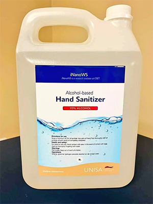 iNanoWS engaged with South African Breweries to request a large amount of waste beer, which contains an average 8% of ethanol (alcohol). Staff purified and distilled the beer further to make pure ethanol, which they have used for the hand sanitisers. The institute produced 250 litres of hand sanitiser that has been branded with the iNanoWS logo and distributed to all the Unisa campuses through University Estates.