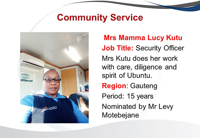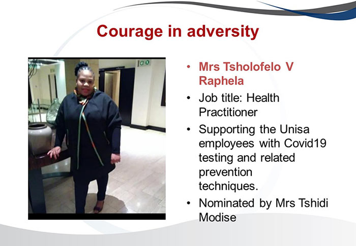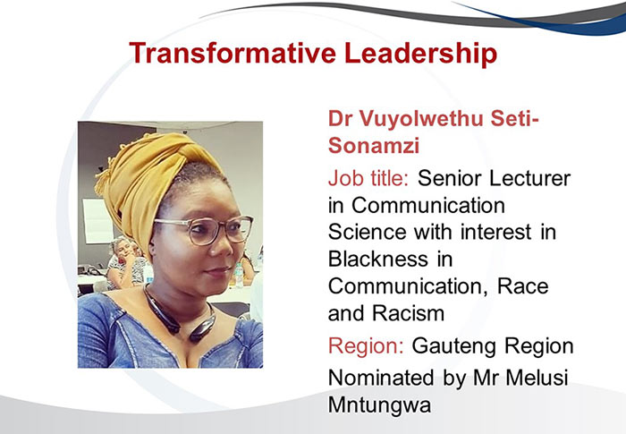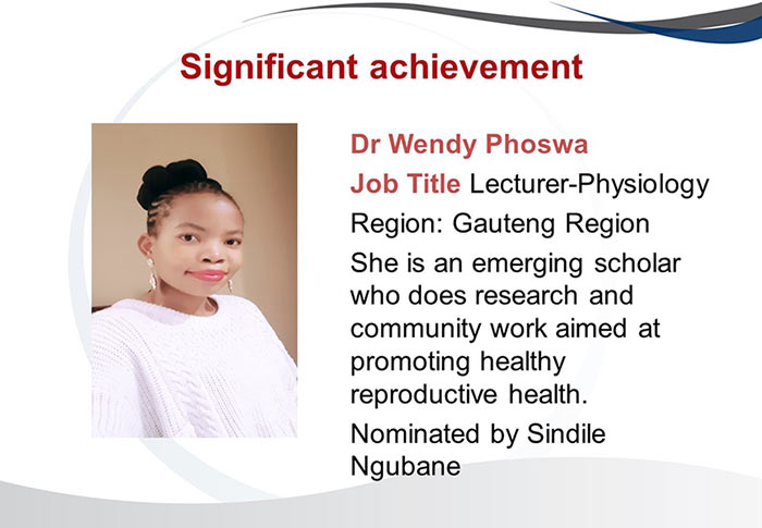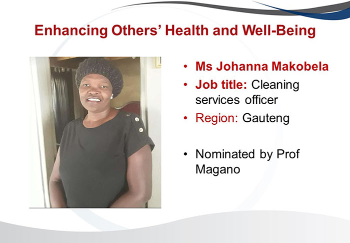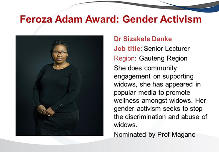 And the 2020 winners are Dr Sizakele Danke: Feroza Adam Award - Gender Activism; Johanna Makobela: Enhancing Others’ Health and Well-Being; Mamma Lucy Kutu: Community Service; Dr Vuyolwethu Seti-Sonamzi: Transformative Leadership; Pindiwe Seloma: Transformative Leadership; Dr Wendy Phoswa: Significant Achievement; and Tsholofelo Raphela: Courage in Adversity.