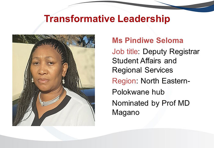 "I am delighted to congratulate both nominees and the winners. May you continue on your paths of excellence. To our winners, well done. We salute and honour you. May you become ever more Unisa women of substance!"