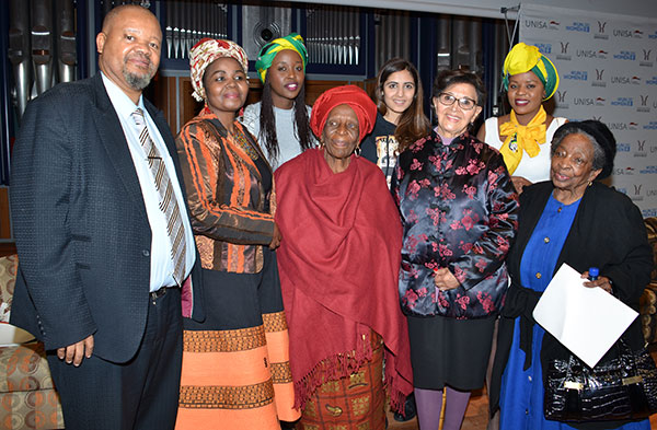 Prof Mandla Makhanya, (Principal and Vice-Chancellor, Unisa), Dr Vuyo Mahlati, (Trustee: SAWID), Nompendulo Mkatshwa (SRC President: University of the Witwatersrand), Violet Sarah Matlou (1956 Women’s March Veteran), Shaeera Kalla (former SRC President: University of the Witwatersrand), Sophia Williams-De Bruyn, (1956 Women’s March Veteran), Nontsikelelo Nako (Deputy Secretary General: National SRC, Unisa), and Thandi Emma Mashinini (Women Activist Veteran)
