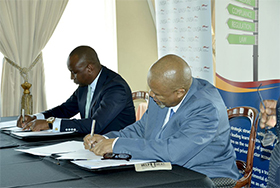 Prof Doutor Alfeu Jacinto Vilanculos, ISCAM Managing Director, and Prof Mandla Makhanya, Unisa Principal and Vice-Chancellor, signing the MoU