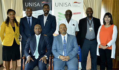 Front, from left: Prof Mandla Makhanya, Principal and Vice-Chancellor of Unisa; Prof Doutor Alfeu Jacinto Vilanculos ISCAM Managing Director. Back, from left: Elsa Jorge, Executive Secretary; Emidio Mabjaia, Accounting Course Coordinator; Prof Lungile Ntsalaze, Acting Executive Dean: College of Accounting Sciences; Prof Harry Nengwekhulu, Director: Unisa School of Governance; Dr Somadoda Fikeni, Director: VC Projects and Advisor to the Principal; Prof Veronica McKay, Acting Vice-Principal: Teaching Learning, Community Engagement and Student Support