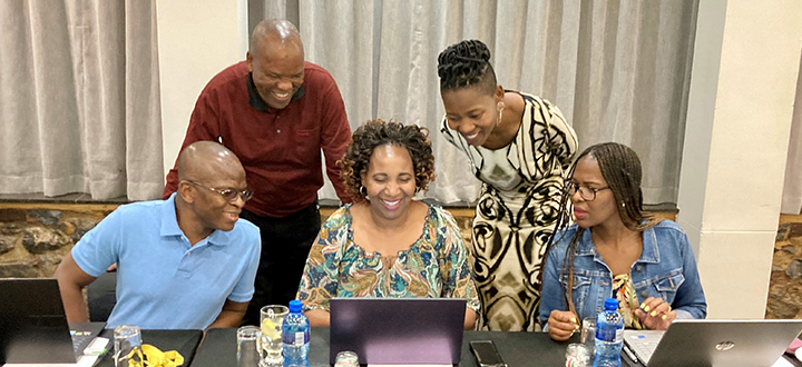Facilitators Prof. Lesiba Teffo and Prof. Puleng Segalo (back, from left) engaging with participants Marshall Hwehwe, Mokgadi Senyolo and Modiehi (Mo) Rammutloa (front, from left)