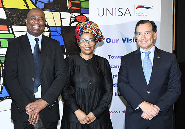 From left to right: Dr Phil Mjwara, Director-General of the Department of Science and Innovation, Prof Puleng LenkaBula, Principal and VC of Unisa, and His Excellency, Manuel Carvalho, Ambassador of Portugal to the Republic of South Africa