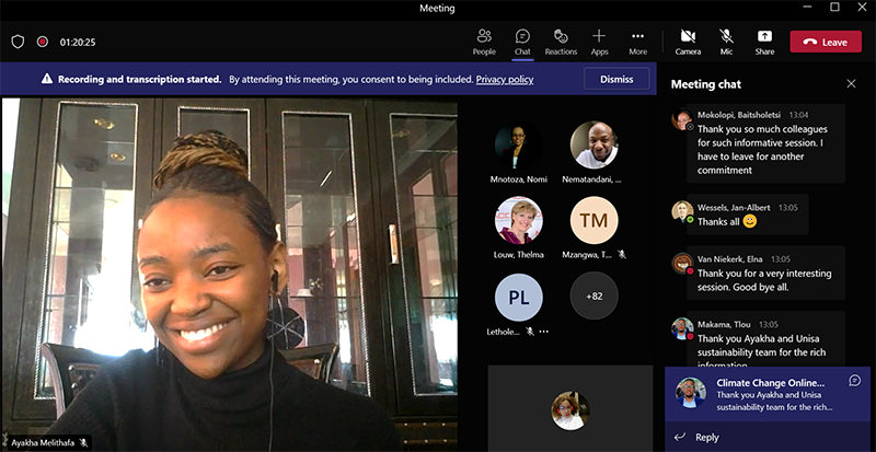 On 10 June 2022, Unisa’s Quality Assurance and Enhancement Department hosted an online presentation to discuss the effects of climate change in South Africa and possible ways to fight it. Dr Thelma Louw, Head of the Sustainability, Monitoring and Evaluation Directorate, welcomed the audience by saying it was befitting for organisers to invite a young speaker in recognition of Youth Month.
