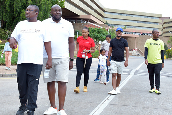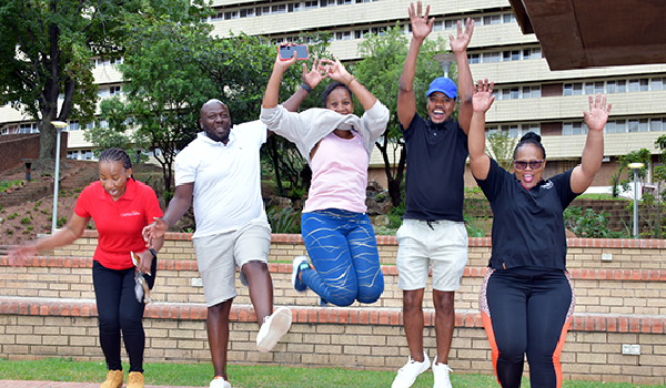 Department of Quality Assurance and Enhancement Members setting the tone for the fun walk (from left): Kedibone Thantsha, Risk Specialist; Rendani Nematandani, Sustainability Officer; Nompe Ntombela, Integrated Report Writer; Elliot Makama, Performance Auditor; and Nomi Mnotoza, Administrator