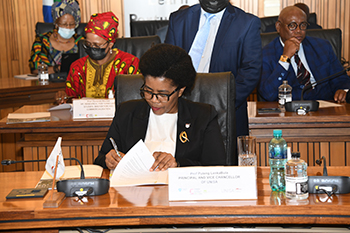 Prof Puleng LenkaBula, Principal and VC of Unisa signs the memorandum