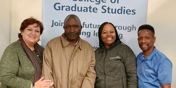 Elena Swanepoel (CGS Postgraduate), Godfrey Mutsago (Unisa alumnus), Penny Ngcobo (CGS Postgraduate) and Sipho Ntanjana (Department of Institutional Advancement).