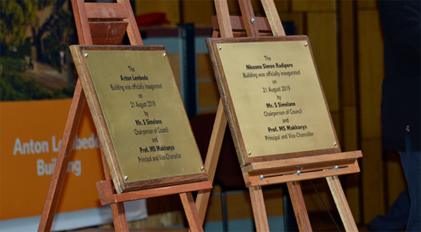 Two of the unveiled plaques for the newly named Anton Lembede and Nkoana Simon Radipere buildings