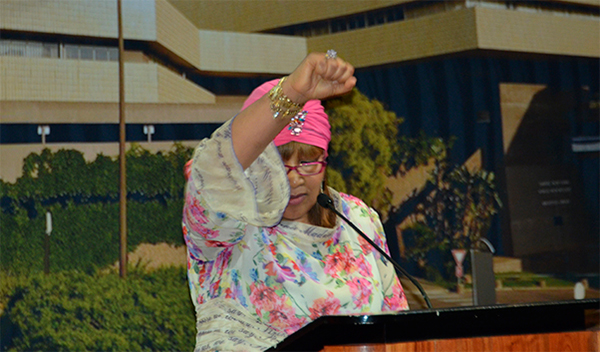 Ambassador Zenani Dlamini chants "Amandla" to close her address