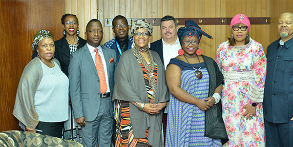 Internal stakeholders, from left: Khanya Mahlare, Executive Director: Department of Institutional Advancement; Dr Marcia Socikwa, Vice-Principal: Operations and Facilities; Dr Phasoane Mokgobu, Chairperson of the Naming and Renaming Committee & Vice-Principal: Institutional Development; Prof Elelwani Farisani, Institutional Forum; Dr Sheila Khumalo, Chairperson of the Unisa Women’s Forum; Johan Jonker, APSA; Tebogo Msabala, NEHAWU; Ambassador Zenani Dlamini; and Prof Mandla Makhanya, Principal and Vice-Chancellor of Unisa.