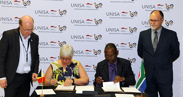 Signing on behalf of their institutions were Prof Mieke Van Herreweghe, Vice-Rector, UGent (centre left) and Prof Stephen Khehla Ndlovu, Vice-Principal: Strategy, Risk and Advisory Services, Unisa (centre right), flanked by Prof Guido van Huylenbroeck, Director of Internationalisation, UGent (left) and Prof Les Labuschagne, Executive Director, Research and Innovation, Unisa (right)