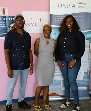 From left: Gedeon Masemola, Unisa DAC Coordinator, Lumka Qina, Unisa Student, and Lusanda Twetwa, manager of the Kwahlwa-Kwasa Multimedia Centre