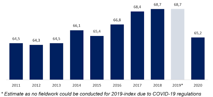 Based on results from the Momentum/Unisa Household Financial Wellness Index (depicted in figure 1), South African households’ overall Financial Wellness score recorded a steep decline from 68.7 points in 2018 to 65.2 points out of 100 (where ‘100’ is indicative of total household financial wellness) in 2020. The results are based on a nationally representative sample of 2 868 households that were interviewed during early 2021.