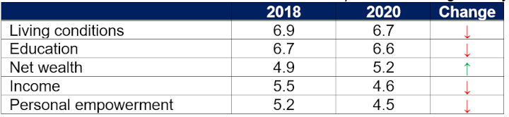 The Momentum/Unisa Household Financial Wellness Index comprises of five components/capitals, which are resources that determine households’ state of financial wellness. Table 1 shows the movement in the five components compared to those of the previous survey. When considering these components, larger adverse impacts were recorded for households' income and personal empowerment levels opposed to their wealth, living conditions and education components during 2020.