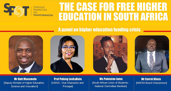Protests regarding what some call #FeesMustFall 2.0 have dominated headlines in recent days, and key stakeholders participated in an online panel discussion of issues surrounding free higher education on 18 March 2020. The event was hosted online by SPOT (Strategic Perspective on Transformation), and the panellists were Palomina Jama, National Committee Member of the South African Union of Students; Prof Puleng LenkaBula, Unisa Principal and Vice-Chancellor; Buti Manamela, Deputy Minister of Higher Education, Science and Innovation; and Ernest Khosa, Chairperson of the Board of the National Student Financial Aid Scheme (NSFAS).