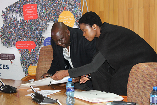 Dr Rakwena Monareng, Director: DLS, assisted by Lillian Maja, Language Practitioner: DLS, during the signing of the policy
