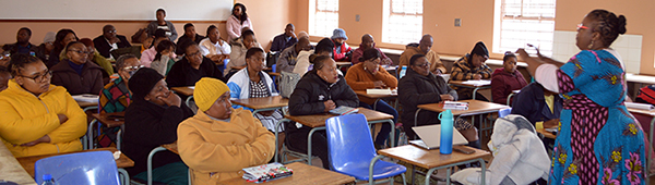 Mantoa Potjo, Student Counsellor from Unisa's Bloemfontein RSC, sharing information with Life Orientation educators from the Phuthaditjhaba area