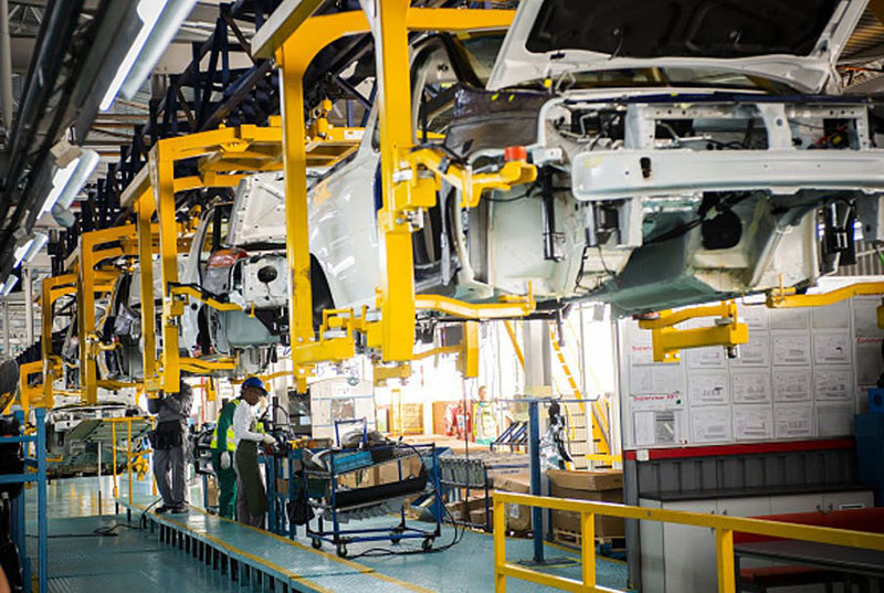 Automobile body shells hang from cradles on the assembly line at a car plant in South Africa. Waldo Swiegers/Bloomberg via Getty Images