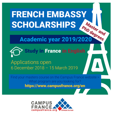 South African graduates are invited by the Embassy of France to apply to their competitive Master's and Doctorate Scholarship programme.