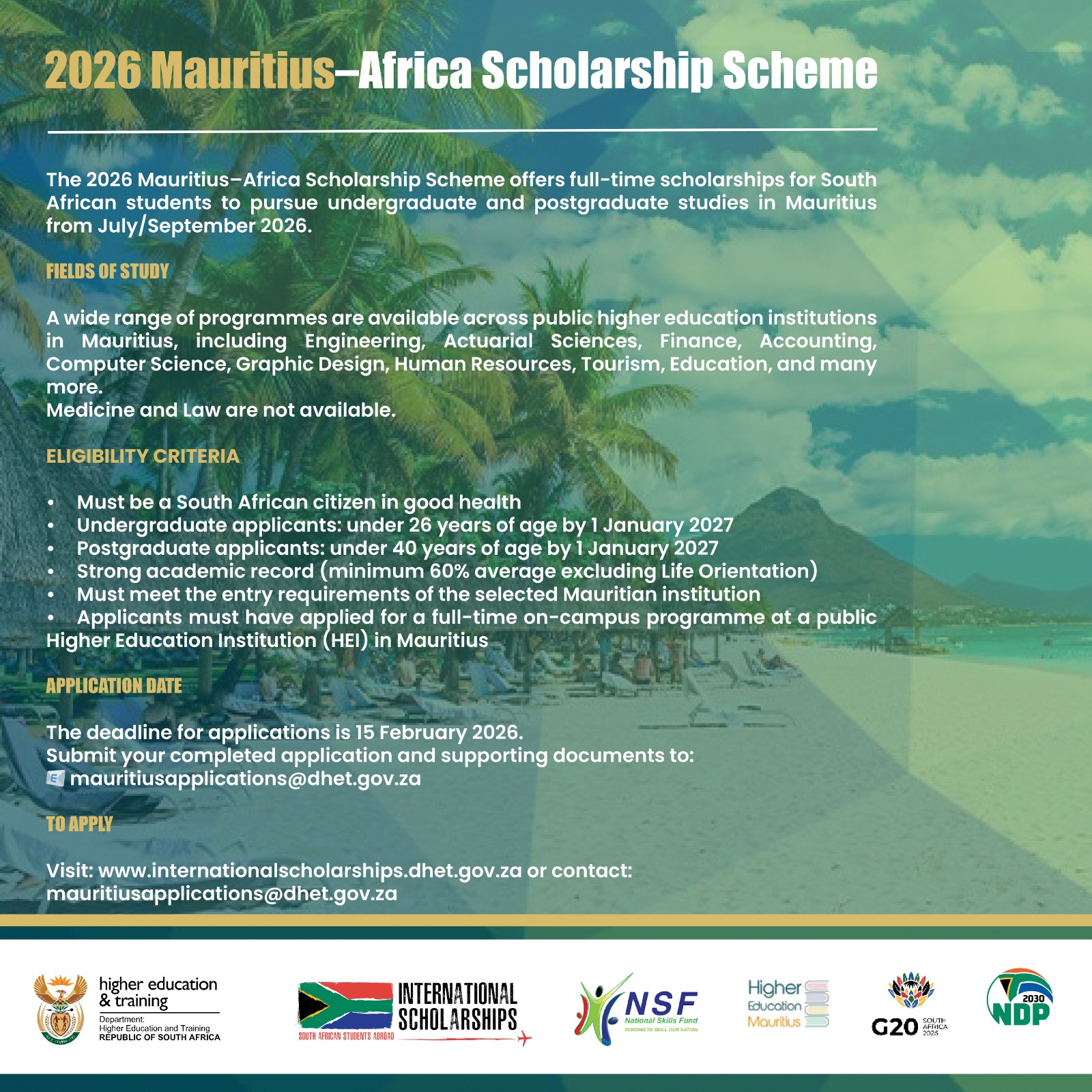 - Call for applications: Open scholarships for 2026 in Mauritius. Click here for the 2026 Mauritius-Africa scholarship scheme programme.
