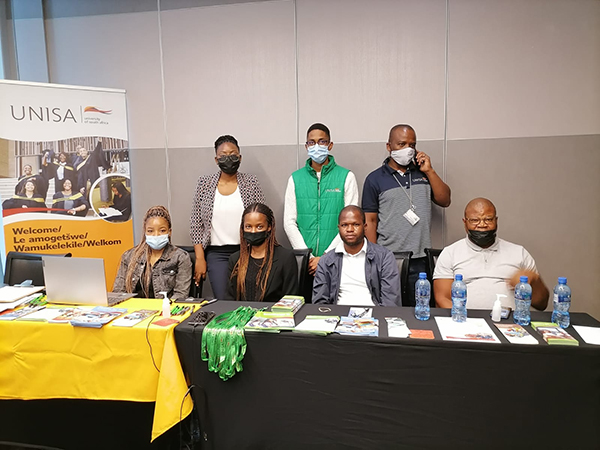 Representing Counselling and Career Development Directorate are Trainee Career Guidance Practitioner; Ms Bongiwe Mkhondo, Ms Mahlatse Mphahlele, Mr Stanley Msimango; CAS Marketing Section, Mr Moses Molapise; Unisa Library. Back: Ms Koketso Munonde, Mr Tshego Mashigo; CAS: Student support and Mr Kagiso Mekeo; Student Counsellor.
