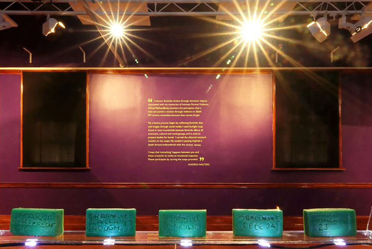 She focuses on gender-based violence and femicide (GBVF) in the country. Walters further said that her work is practice led and inspired by culture material. “Meaning,” she added, “what I use is directly related to the women I am speaking about. I do not use conventional media, but I am inspired by what is found in women's places such as Sunlight green soap bars and white wax candles.” She further explained that she is interested in engaging school children and university students to advance the educational value of her artwork.