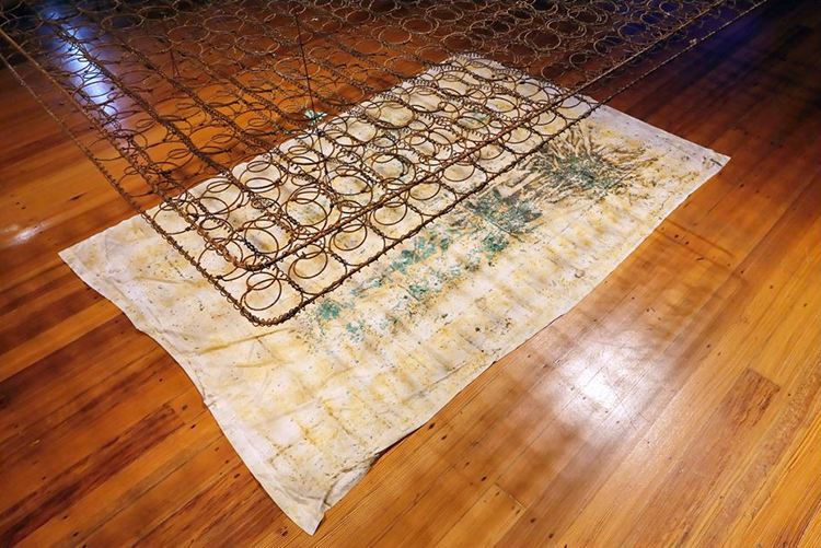 Andrea Walters, #OverMyDeadBody III (2022). Suspended rusted mattress, double bedsheet, and Sunlight soap residue.
