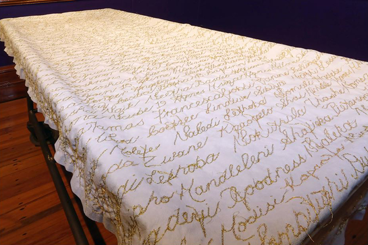 Andrea Walters, #OverMyDeadBody IV (2022). The death shroud, embroidered in gold, names femicide victims in South Africa. It is mounted on a mortuary gurney and accompanied by a lament, entitled Thula. The lament was created and performed by IPV survivor, Mariechan Luiters in response to her own experiences. (Gurney kindly loaned by Ciara Struwig.)