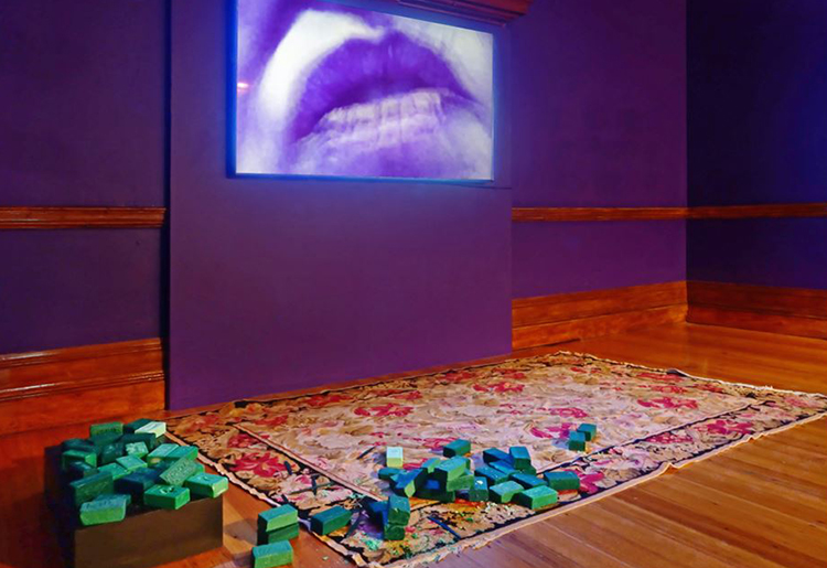 Andrea Walters, #OverMyDeadBody II (2022). The video performance where Andrea name the dead, recounting how they died and their ages. Below the screen is an old rug where visitors carved messages and mouths into the soaps provided.