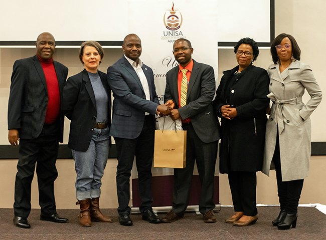 From left: Dr Stanley Nhlapo (Regional Service Centre Manager: Unisa Midlands Region), Cilla Boucher (Unisa Alumni Relations Officer), Frankie Mojapelo (Acting Director: Institutional Advancement), Thabo Qhesi (guest speaker), Lerato Khomari (Convenor of the Unisa Lesotho Alumni Chapter) and Angie Mopape (Acting Regional Director: Unisa Midlands Region)