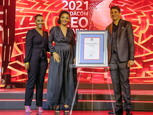 Receiving the 2021 Vodacom CEO Award from Shameel Joosub (right), Vodacom Group CEO, are Sibongile Mbuli (centre), Executive Head: Internal Communications, Vodacom Group, and Thato Leokaoke (left), Specialist: Internal Communications, Vodacom Group