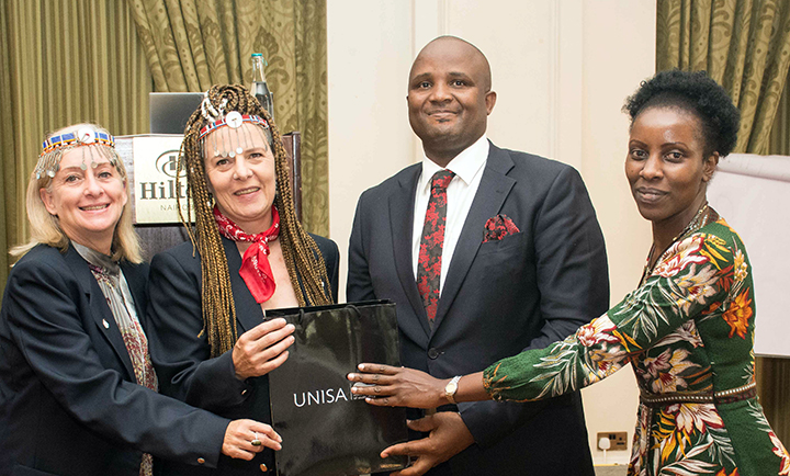 Lynette van Niekerk and Cilla Boucher of Unisa’s Department of institutional advancement are joined by Erick Opingo (guest speaker) and Faith Wamuyu (Unisa Alumni Convenor in Kenya)
