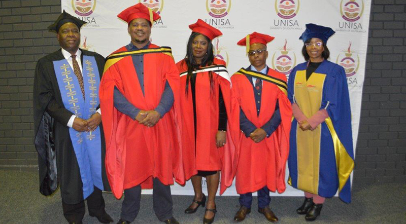 From left: Ms Angie Bopape (Acting Regional Director- Midlands Region) Midlands management with some of the conferred PhD degree students; Motshweneng Teboho Simon, Mwabsa Mushimbile Mwilima, Sibiya Malusi, Dr Stanley Nhlapo (Centre Manager Unisa Midlands Region)